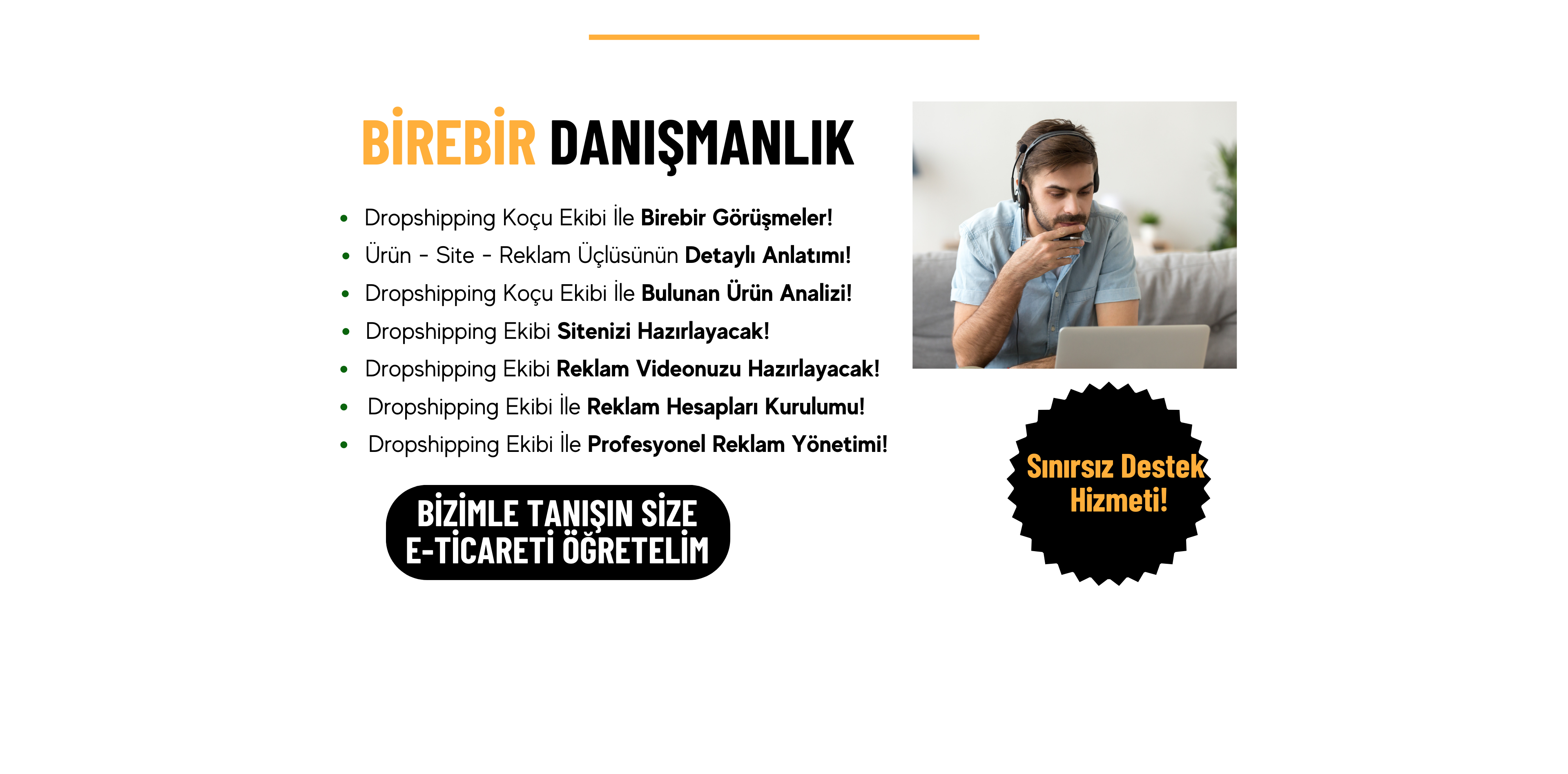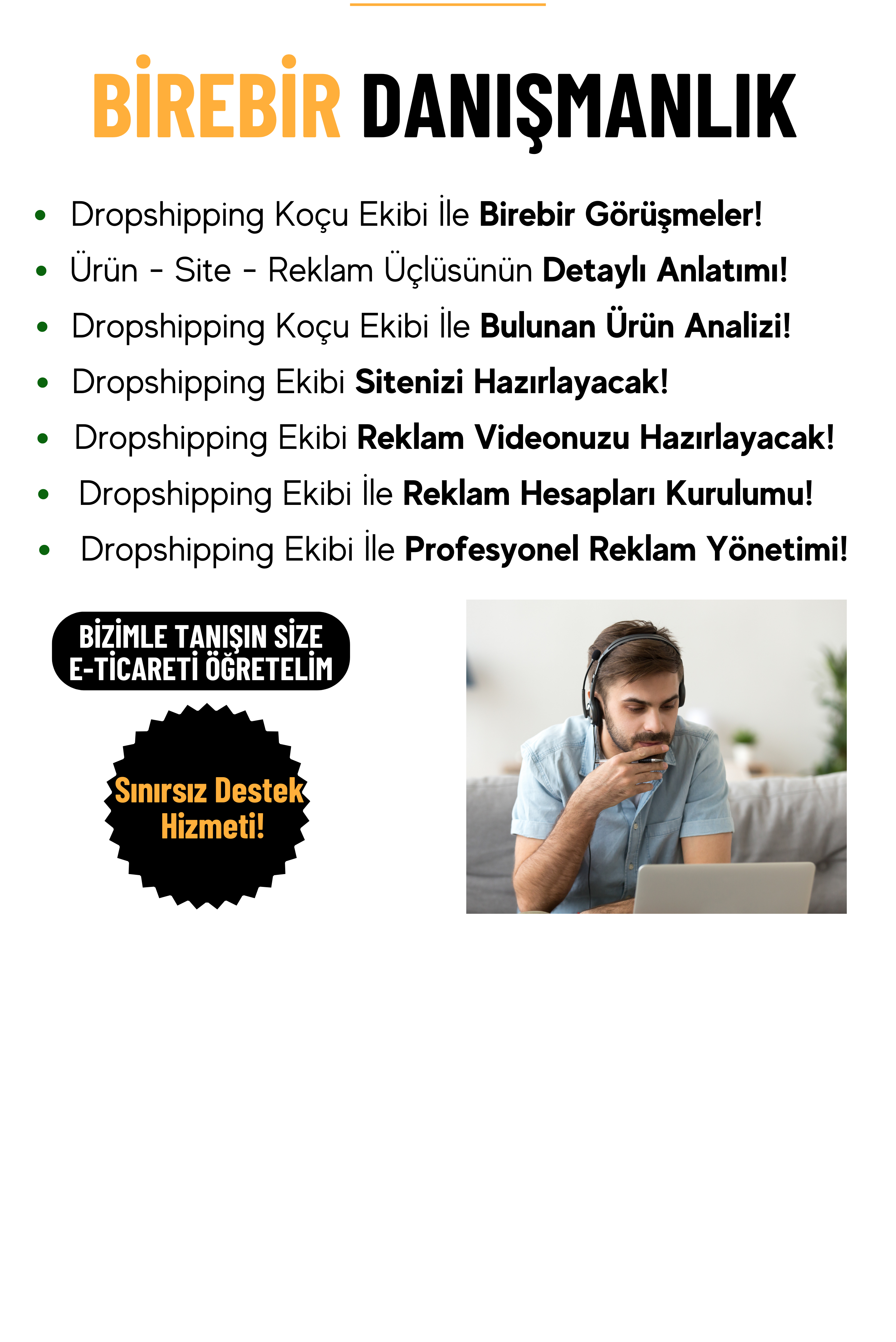Birebir Danışmanlık hizmetimizi aldıktan sonra ekibimiz sizlere ulaşacaktır. Ardından sizinle birlikte uygun zamanlar belirleyip hemen danışmanlık hizmetimizi başlatacağız. Canlı birebir bağlanarak alanında uzman kadromuzdan birebir eğitimler alacaksınız. Önce Ürün ve Pazar araştırması için size ürün nasıl bulunur bunu anlatacağız.