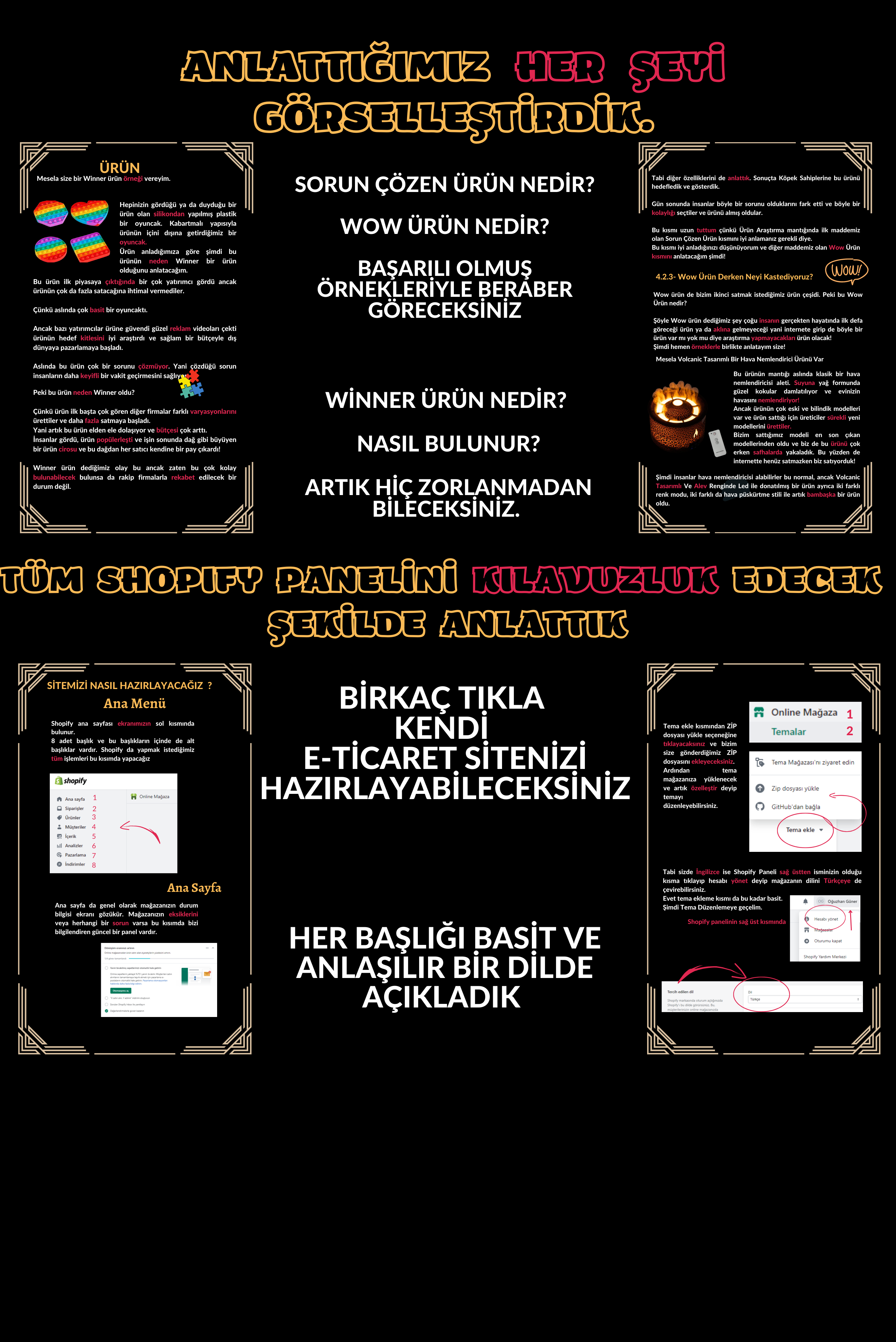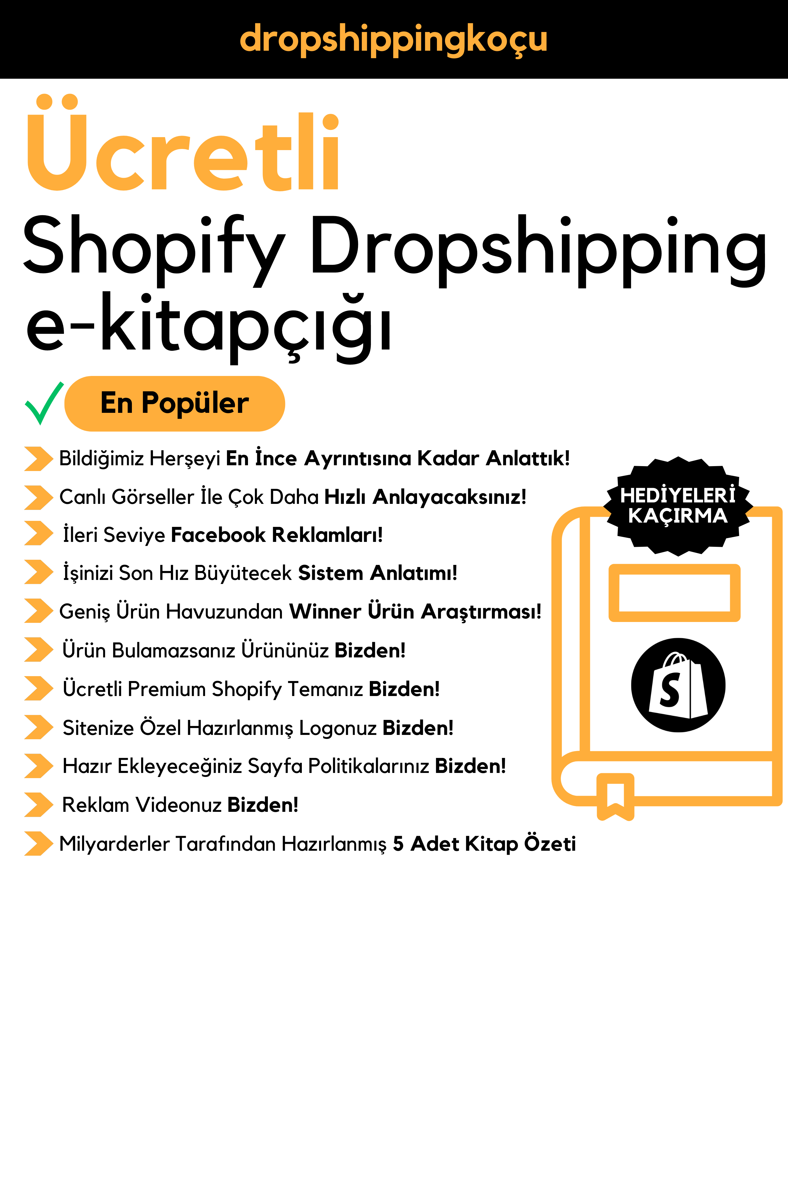 Shopify Dropshipping Ücretli E-Kitapçığı alanında uzman Dropshipping Koçu ekibi tarafından yazıldı ve düzenlendi. İçeriği 11 Başlık ve 121 Alt Başlıktan oluşmuştur. Shopify Dropshipping de sıfırdan başlayıp satışa götürmeye yönelik bildiğimiz her şeyi anlattığımız bir kitapçıktır. Tüm bölümleri canlı görseller ile hazırladığımız için çok daha kolay ve net bir şekilde anlayacaksınız. Shopify Dropshipping'de olmazsa olmaz Ürün-Site-Reklam üçlüsünü çok detaylı bir şekilde anlattık. Shopify Panelini de aynı şekilde anlattık. Dijital Marketing alanında bir çok örnekli anlattığımız somut verilerle çok sağlam bir kitapçık oldu. Baştan aşağıya ihtiyacınızın ne olduğunu bildiğimiz için tamamen size özel hazırladık. Bu kitapçığı kaçırmak istemezsiniz.